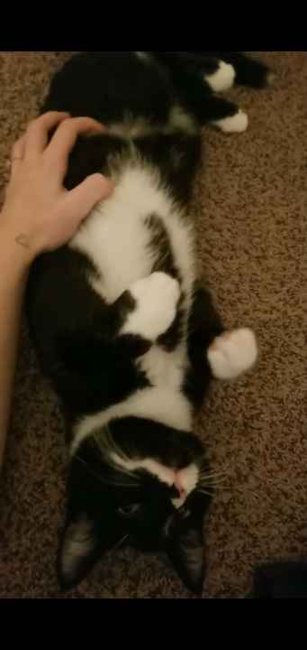 Tuxedo cat with black inside chest/belly, and a hint of white right on the tip of his tail. Absolutely amazing personality. Likes being outside. No collar. Clawed.