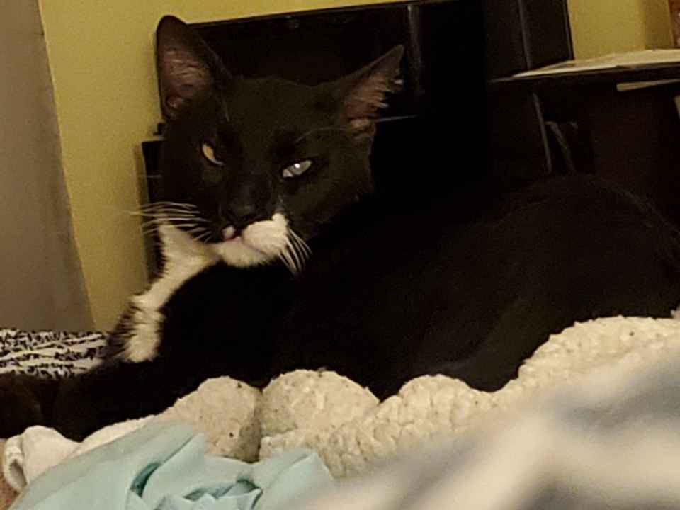 Black with white boots, tiny white tip on tail and cloudy left eye.