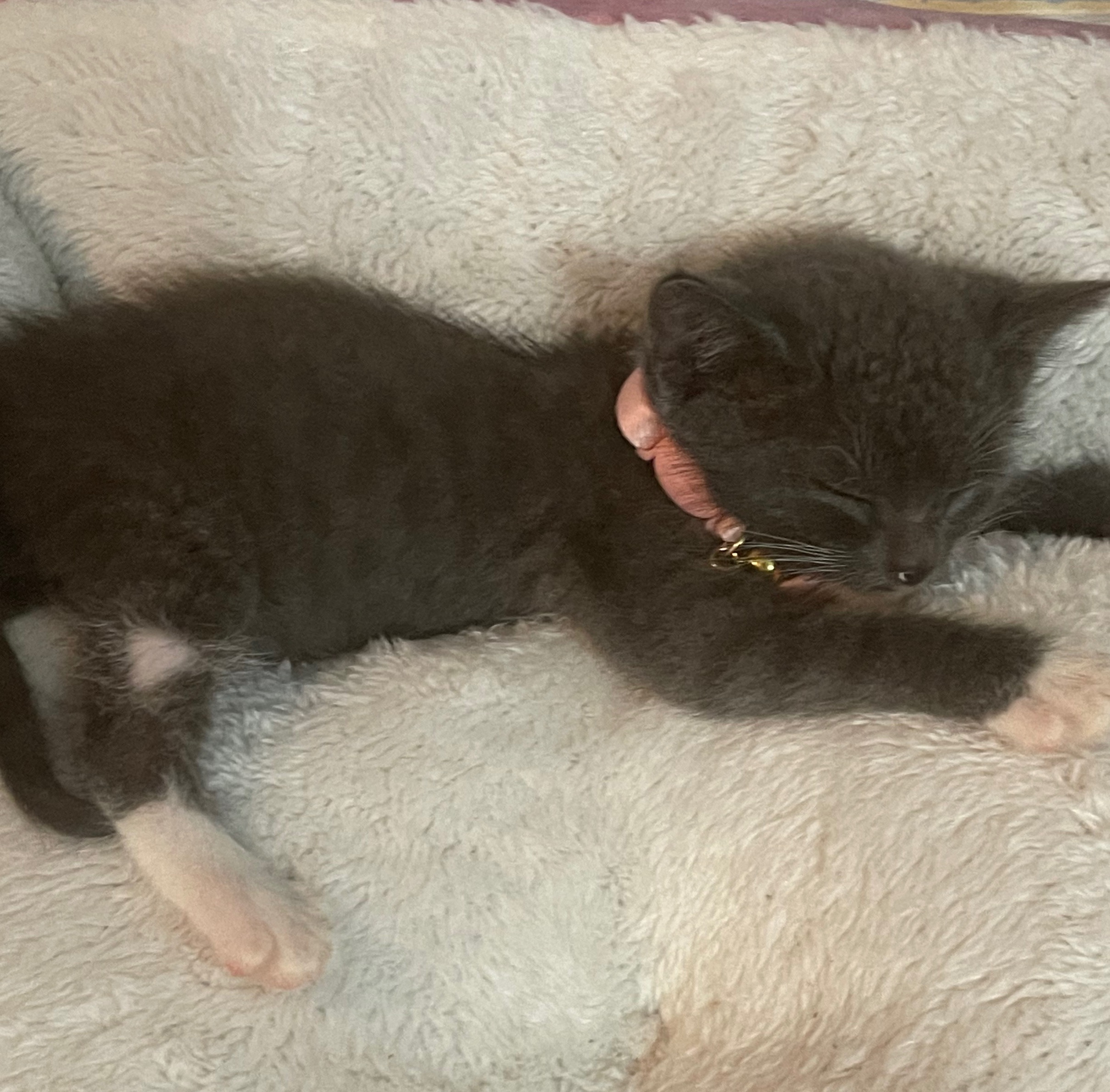 Dark grey kitten with white socks and chest. She also have a little white on the end of her tail.