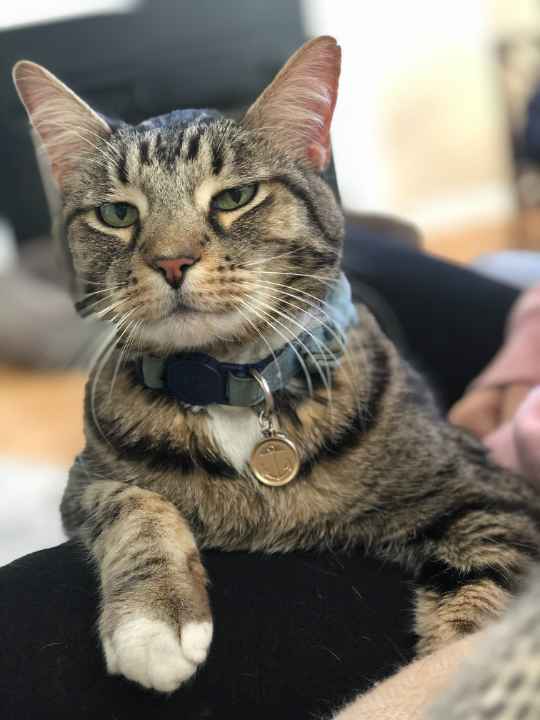 He is a very friendly cat. He loves to be held and will kneed anywhere on you. He will sometimes lovebit your nose.