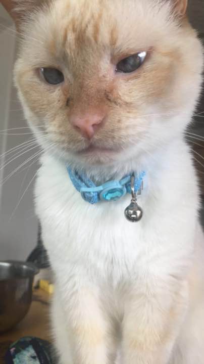 Neutered, flamepoint Siamese with blue eyes and bob tail