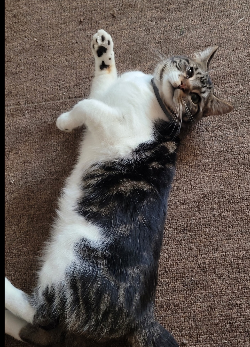 All white from the belly down. Has one bad eye, and a Grey flea collar