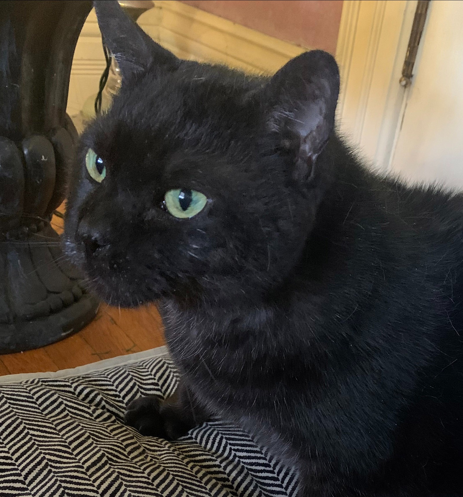 Theo walks with a distinct 'hobble' due to arthritis. He has green eyes.