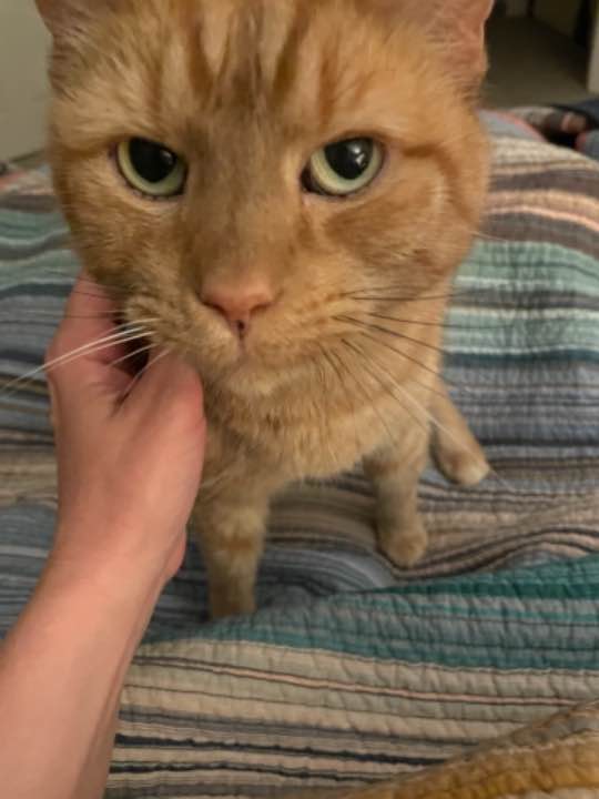 Neutered, microchipped, has black and white whiskers, black freckle on nose