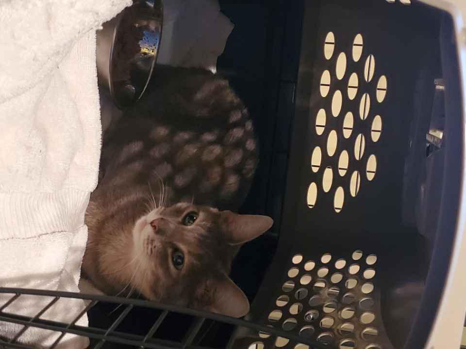 Dilute tabby/tortoiseshell. Green eyes. Has all claws. No chip. Female. Friendly. Long and lean.