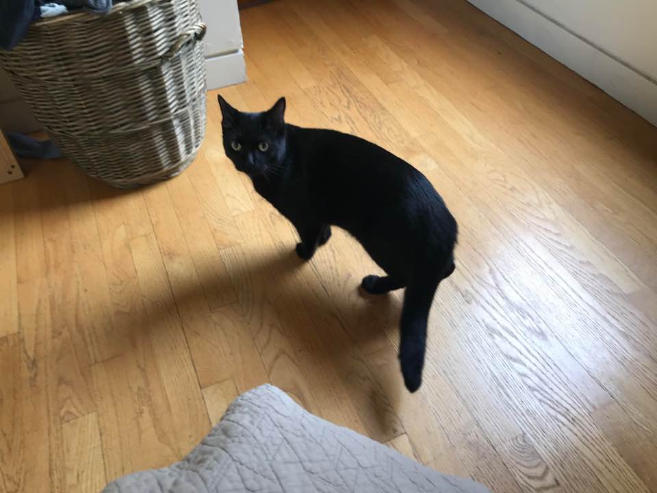 All black except for small white marking under chin and lower down on belly. Sex - male. Young cat very friendly, litter box trained. Green eyes.