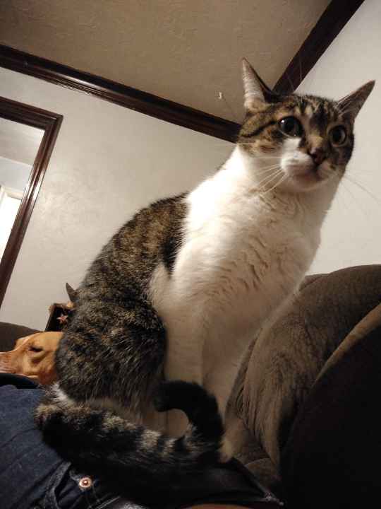 Friendly, but likely scared. Vocal. Will actually respond (meow back) to his name. Comes to shaking treat bags and tuna