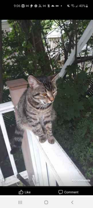 friendly ,loves out doors ,has been known to wander to the highschool tennis court and woods area,Had kittens March 9th ,is lactating.Microchipped .