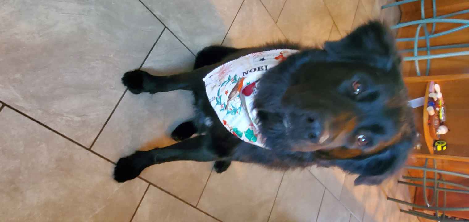Christmas Bandana and red color. Rabies tag. Very friendly