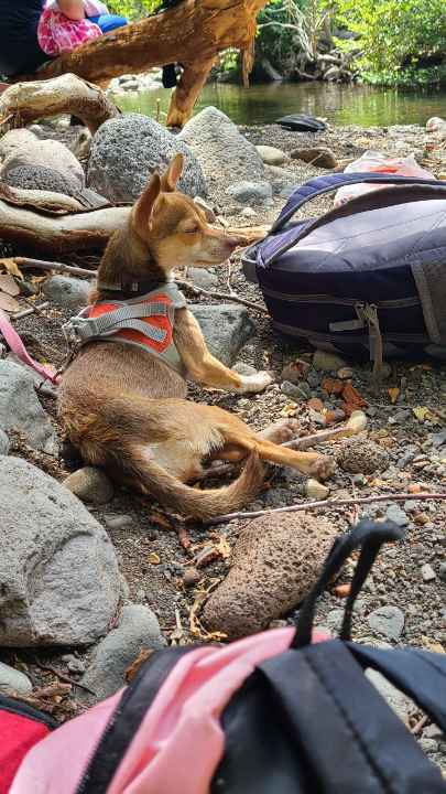 She gets scared of strangers but not dogs, she will bark aggressively if she sees one. She's very energetic so she runs fast. She likes to jump around and stand if you greet her kindly and talk to her. If you would she would feel safe.