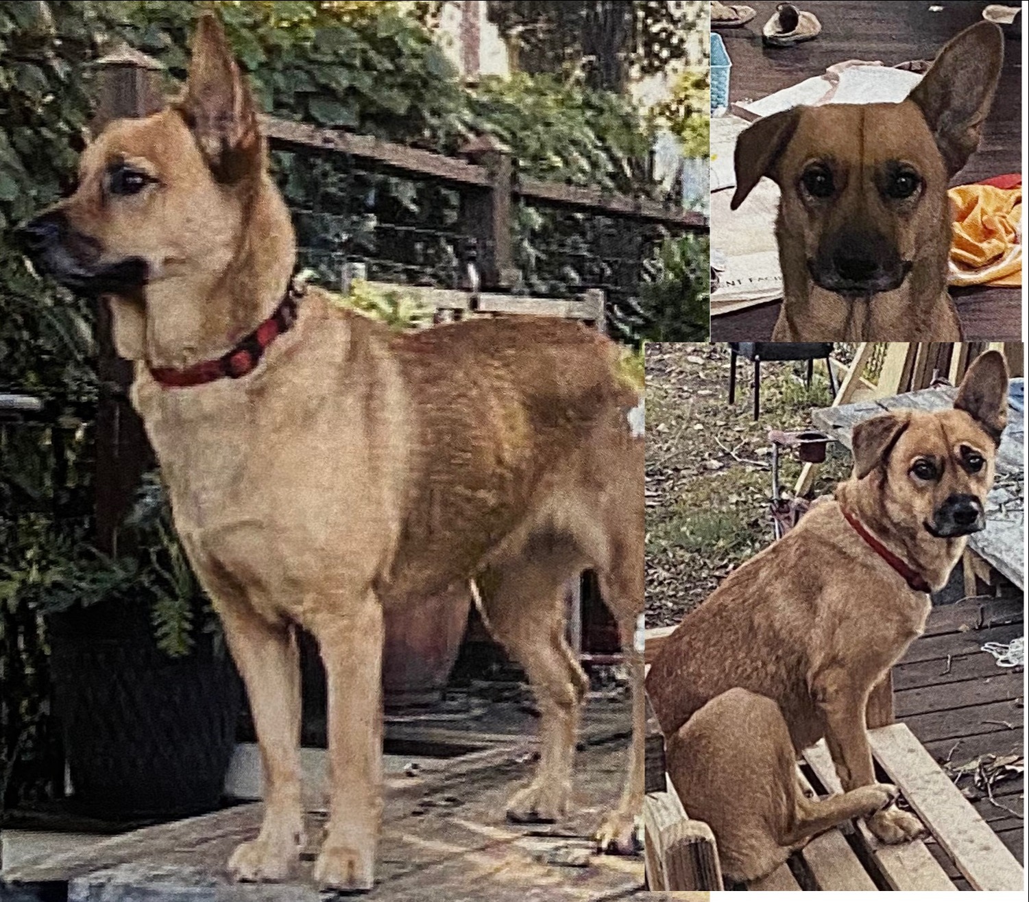 Left ear sticks up and right ear flops. Bushy tail. Black nose & lips