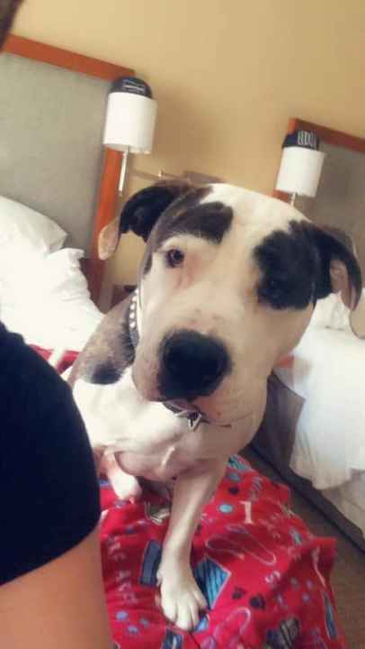He has a scare on top of his head and a scratch looking scare under his eye. Hes mostly white with brindle patches