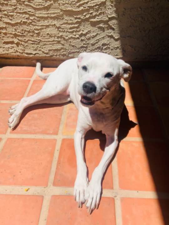Timid, rescue, bald spots around neck from being tied to a rope