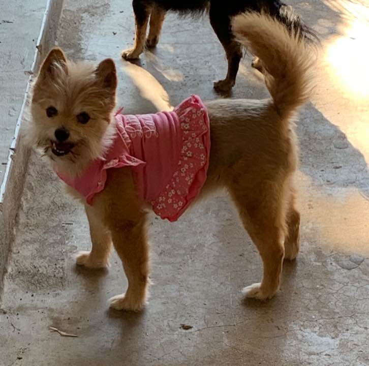Her hair on her body was trimmed down and she has fluffy hair on head and tail. She had tags on and is microchipped.
