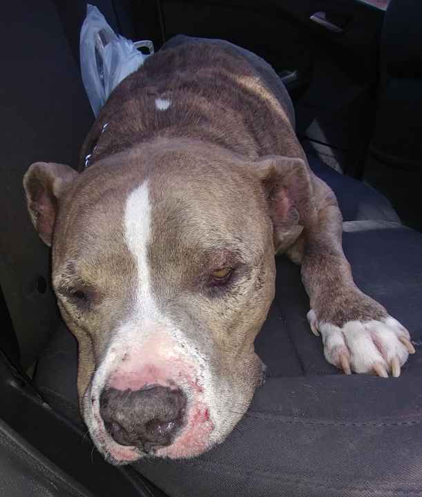 He has a skin problem around nose & down back & tail. Very sweet love dog. Ok with bog' and cats.