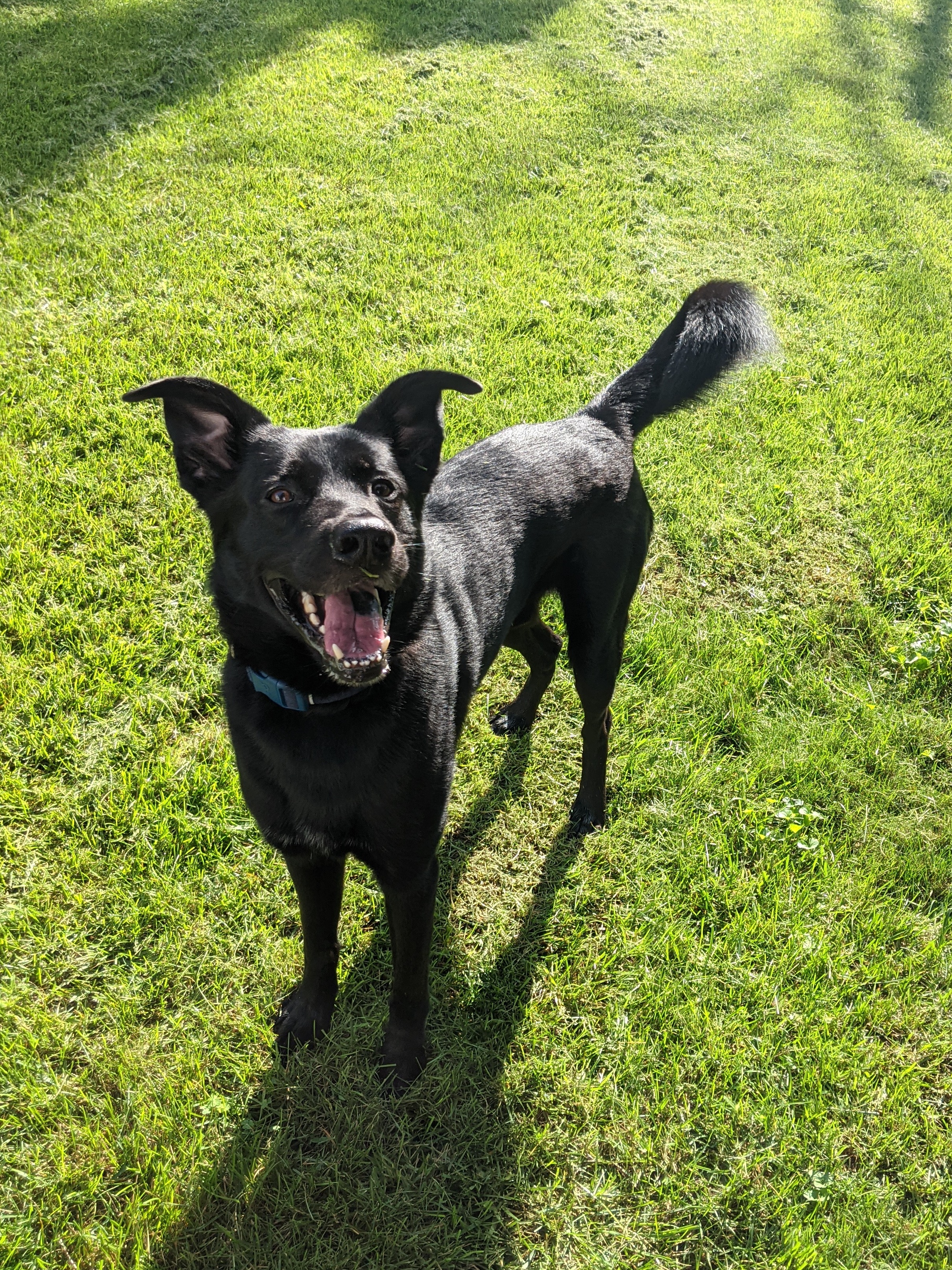 Curly tail. Pretty much all black. Was found without a collar on, next to a leash and collar and bowl w/ dog food.