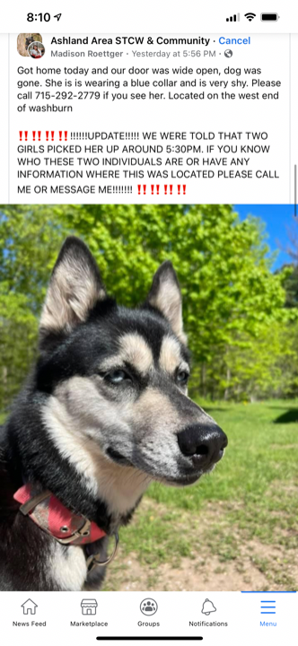She very shy, was picked up by two women in a grey van around 5:30 5/30/21 with Minnesota plates. They have not contacted animal control or the police in our area.