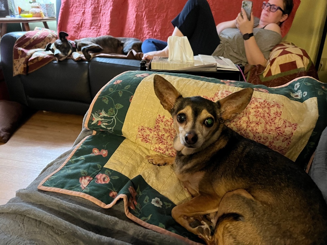 Elkie is the last of 42 puppy mill chihuahuas we rescued last year after the owner passed. Poor Elkie and her 42 offspring were living in deplorable outdoor conditions and she was the matriarch at just 8 yrs old and had been there the longest and in the worst condition. Bred nearly to death, she was feral, and trusted no one. Heartworm positive and mammary tumors dental disease poor coat quality made her treatment plan expensive and time consuming. Elkie has been in a foster home a year and is now cleared of heartworms, her coat is completely glorious and the color has changed from dark black to a beautiful blue fawn. Elkie will never be a cuddler but she likes life on her terms instead. She’ll jump on the couch beside you but not in your lap. She’s great with all dogs big and small and is more cat like in her demeanor and that’s ok! Elkie likes the outdoors exploring and she’ll even walk on a leash now. She uses peepads inside as well. If you’re the kind of person that wants to give a deserving dog a home to retire in and know what unconditional love is all about please consider giving Elkie that chance. Every dog deserves that and we know her person is out there. A woman would be perfect for her. It seems to be what she prefers. She’s perfectly content and doesn’t require much care, just some good food and a place to enjoy her days. Please consider giving Elkie a home. We have waived all adoption fees despite her being our most expensive dog to treat. Please apply at www.peanutsplacerescue.org