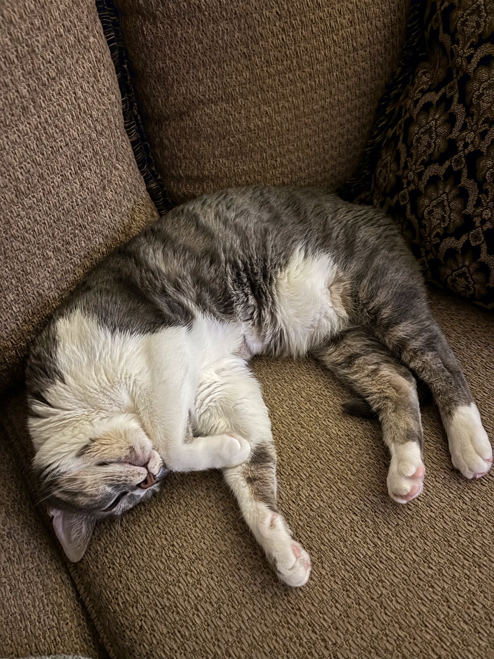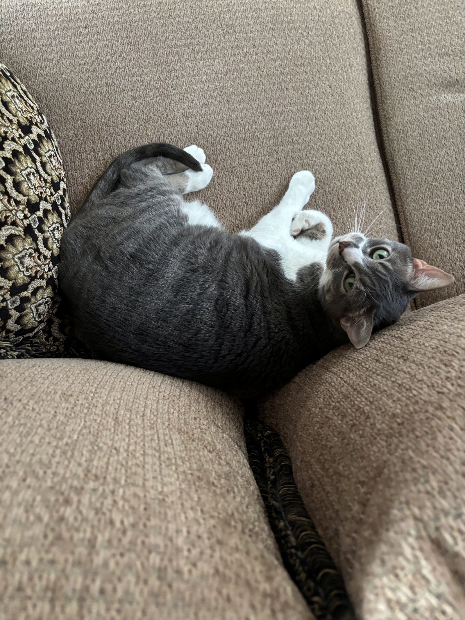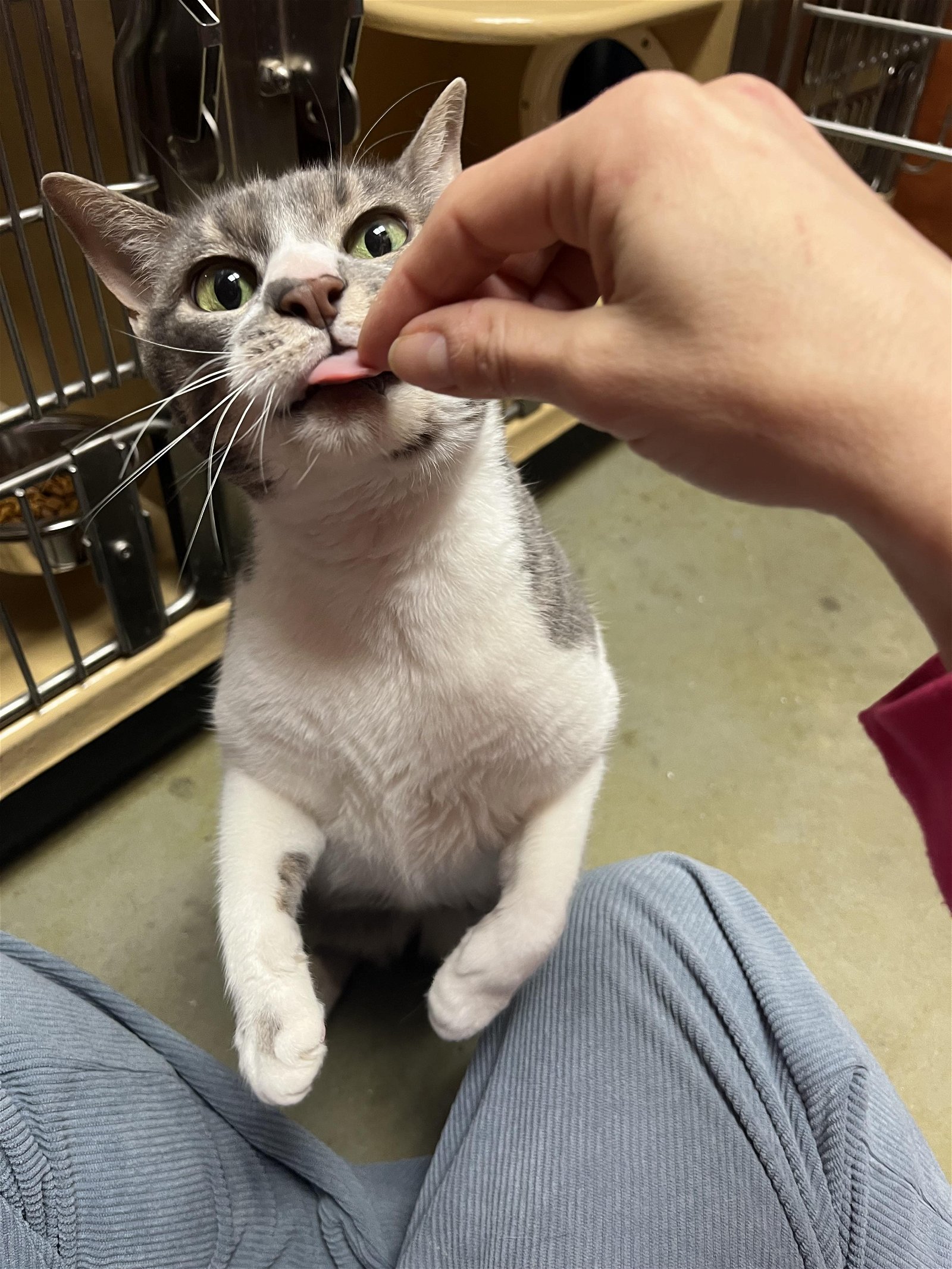 Princess Kate is a very talkative, playful, affectionate girl who wants to be the center of your attention. She may be a princess, but she is the queen of headbutts and chief biscuit maker. She likes to show off her cuteness, and if you put your hand above her head for a headbutt, she will lift up on her hind legs and nuzzle her head against your hand. She will cuddle with you at nap time and has young cat energy during playtime. She loves chasing her feather toy. She wants to be with her humans all the time and will follow you around the house, purring whenever you pet her. Kate also enjoys jumping onto high perches to watch the birds and world go by. Kate would do best with someone who works from home, a retiree, or a family with children so she can constantly be the center of attention.