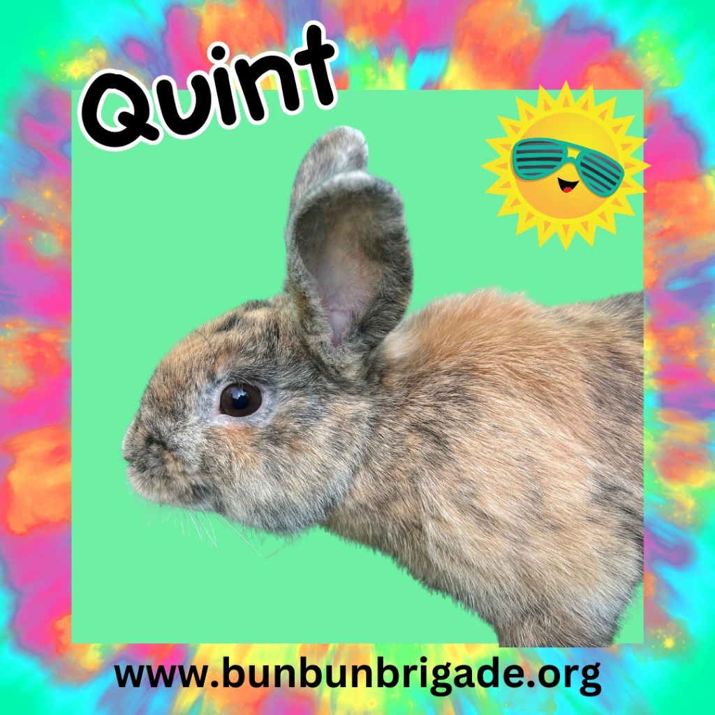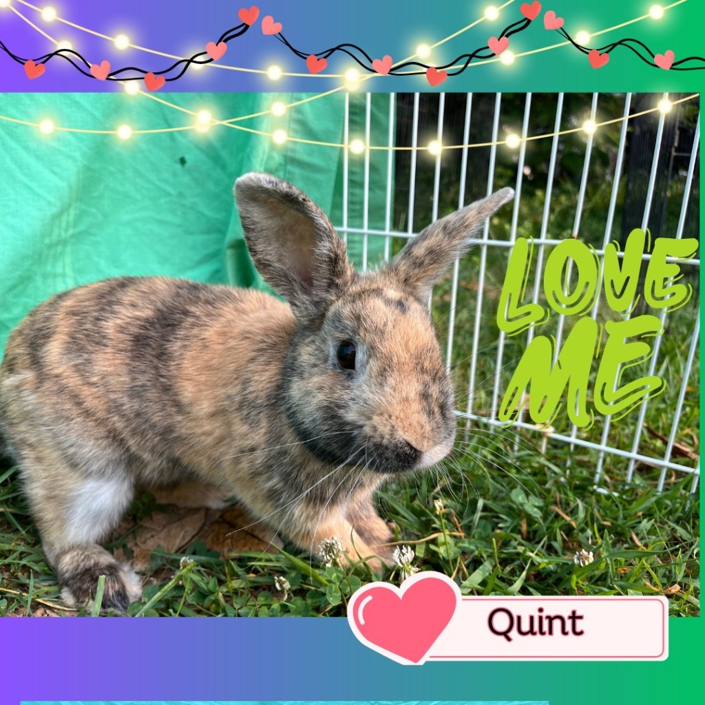 Meet Quint! Hes a harlequin colored mixed bun. Hes around 2 years old and spends lots of time investigating his new environment. Hes getting pretty good at this litterbox and were pretty sure hell be perfect here at the rescue in the next week or so. Quint needs a home that is ready to work with his curiosity by proving him with lots of toys and things for him to explore. Hed be a good match for a family that wants to be creative with feeding puzzles and other forms of enrichment.